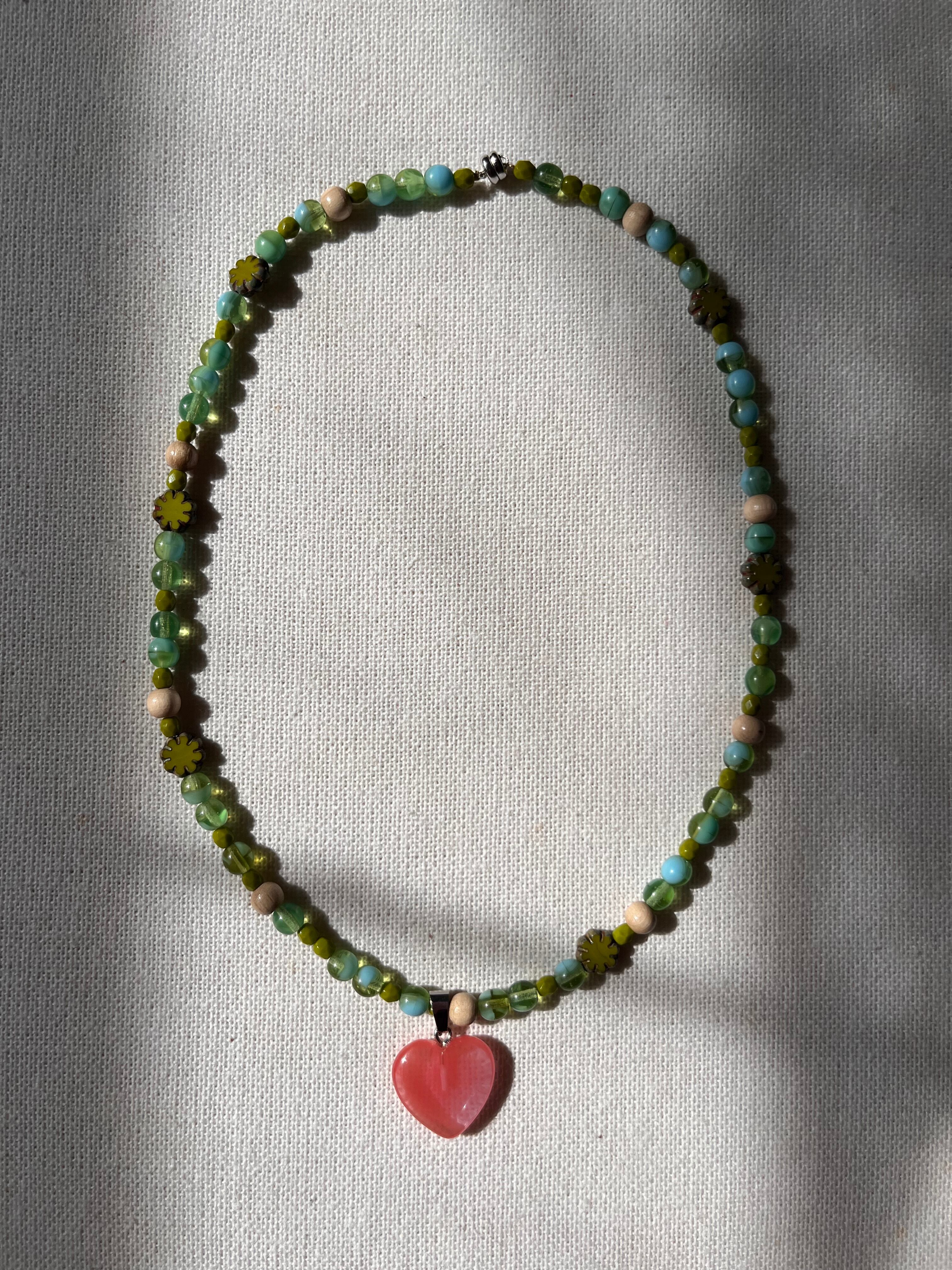 チェコビーズをメインに、柔らかなピンクのハートを組み合わせました。