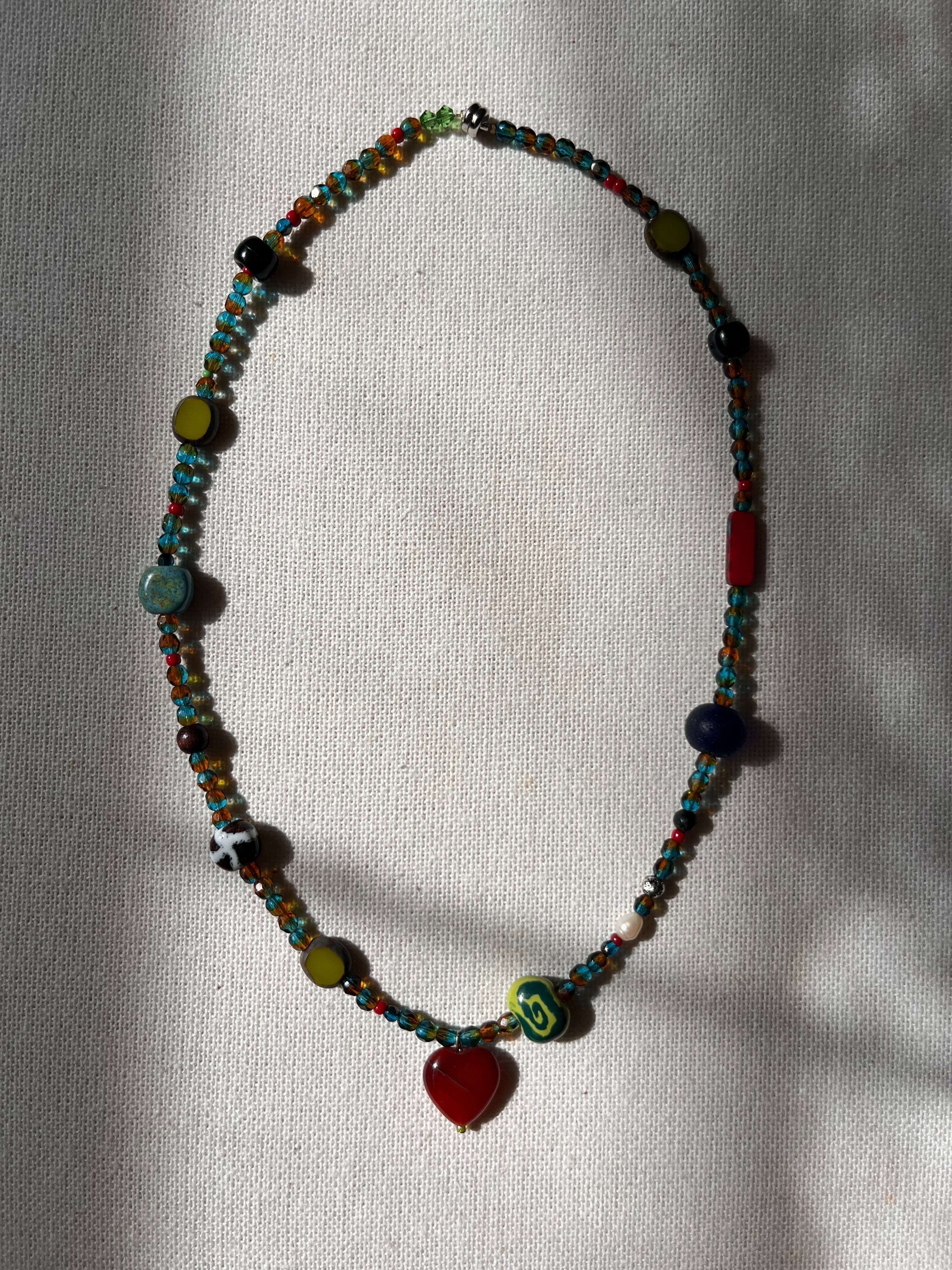 ブルーを基調に、ケニアセラミックビーズやチェコビーズ、炭水パール、蜻蛉玉を組み合わせた一点もの。