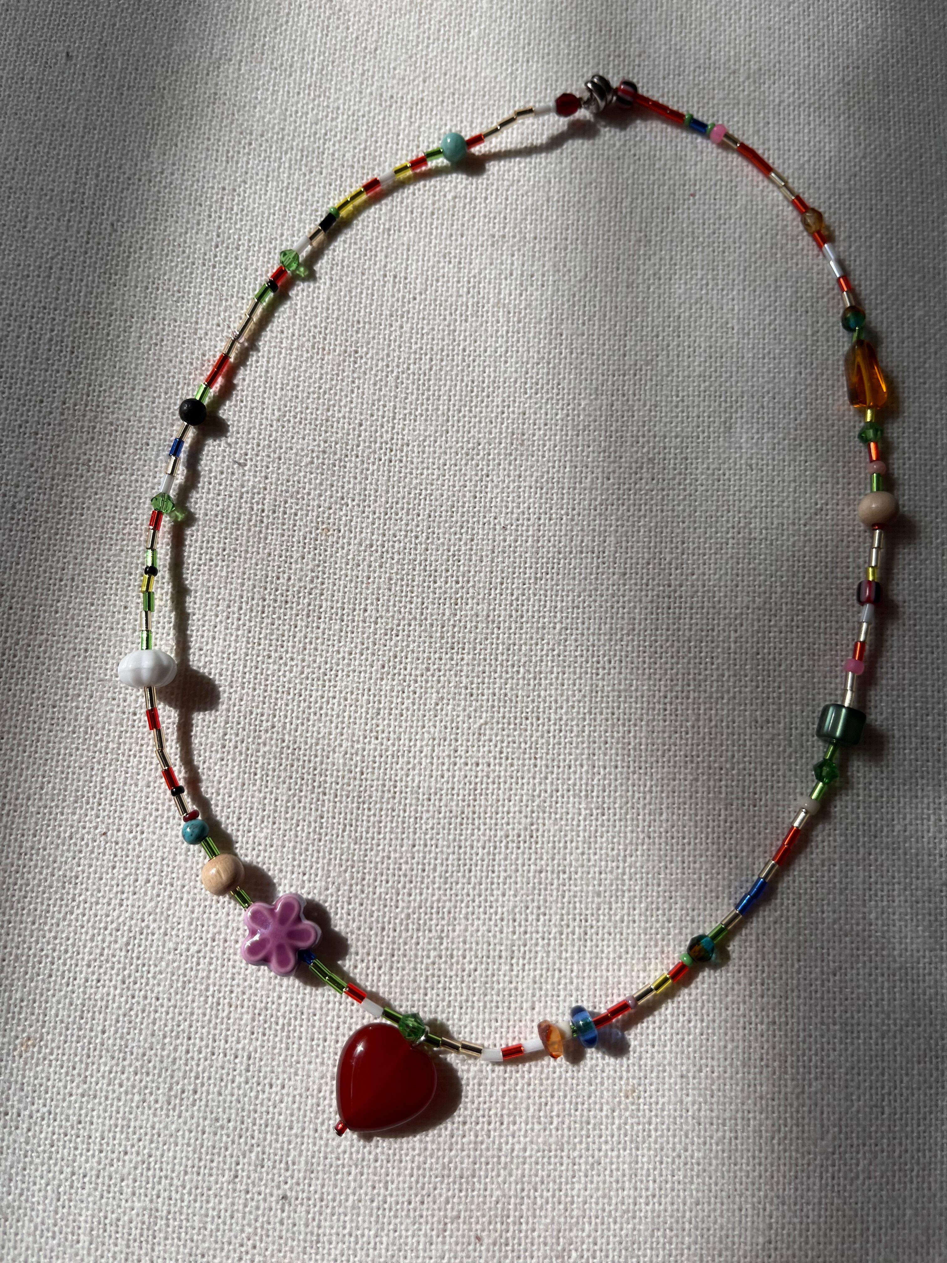 赤いハートをトップにあしらった、カラフルな細ビーズの一点もの。