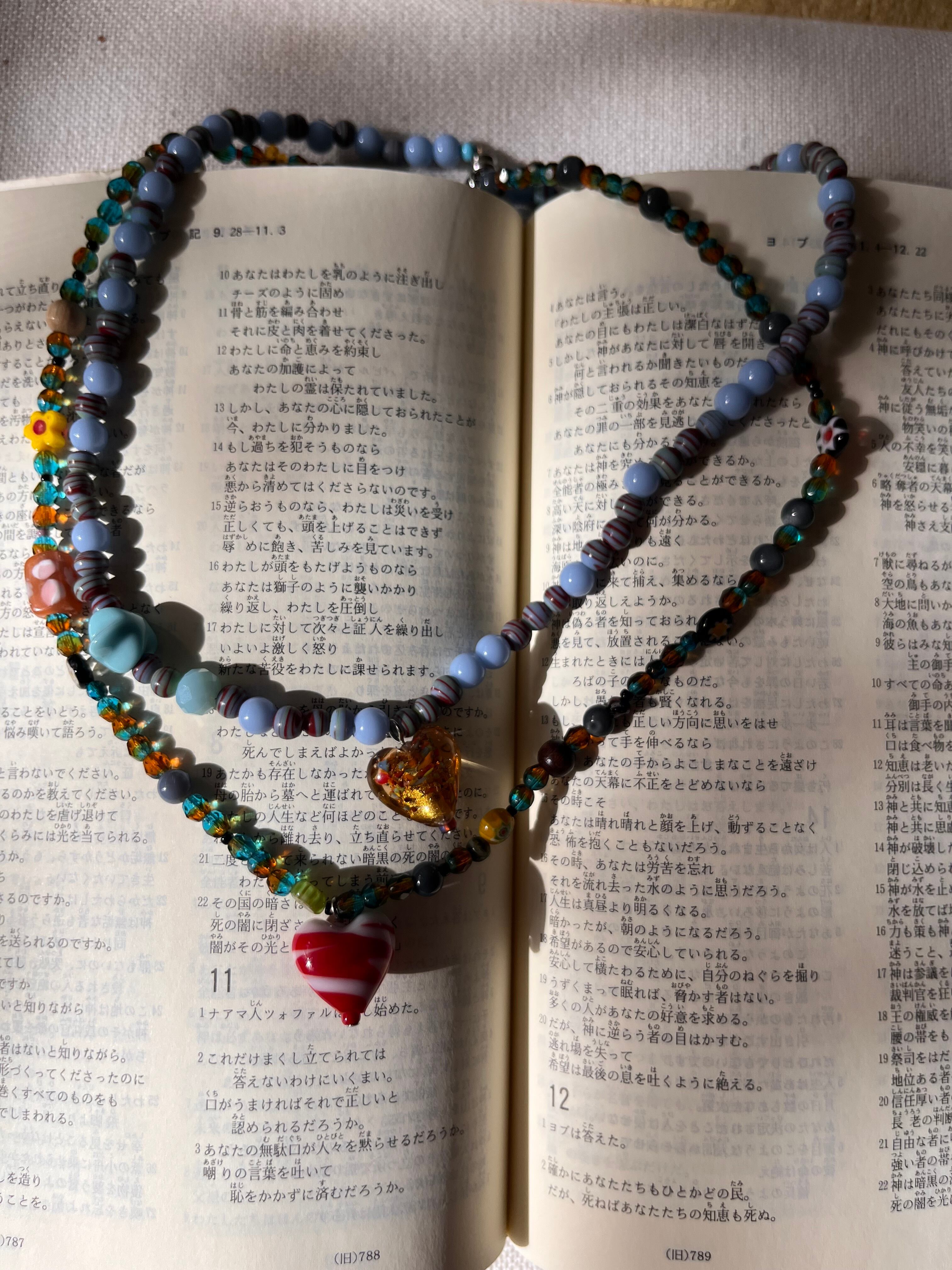カラフルで遊び心あふれるビーズたちと、ポップな赤いハートの存在感が、首元にアクセントを加えてくれる一本。