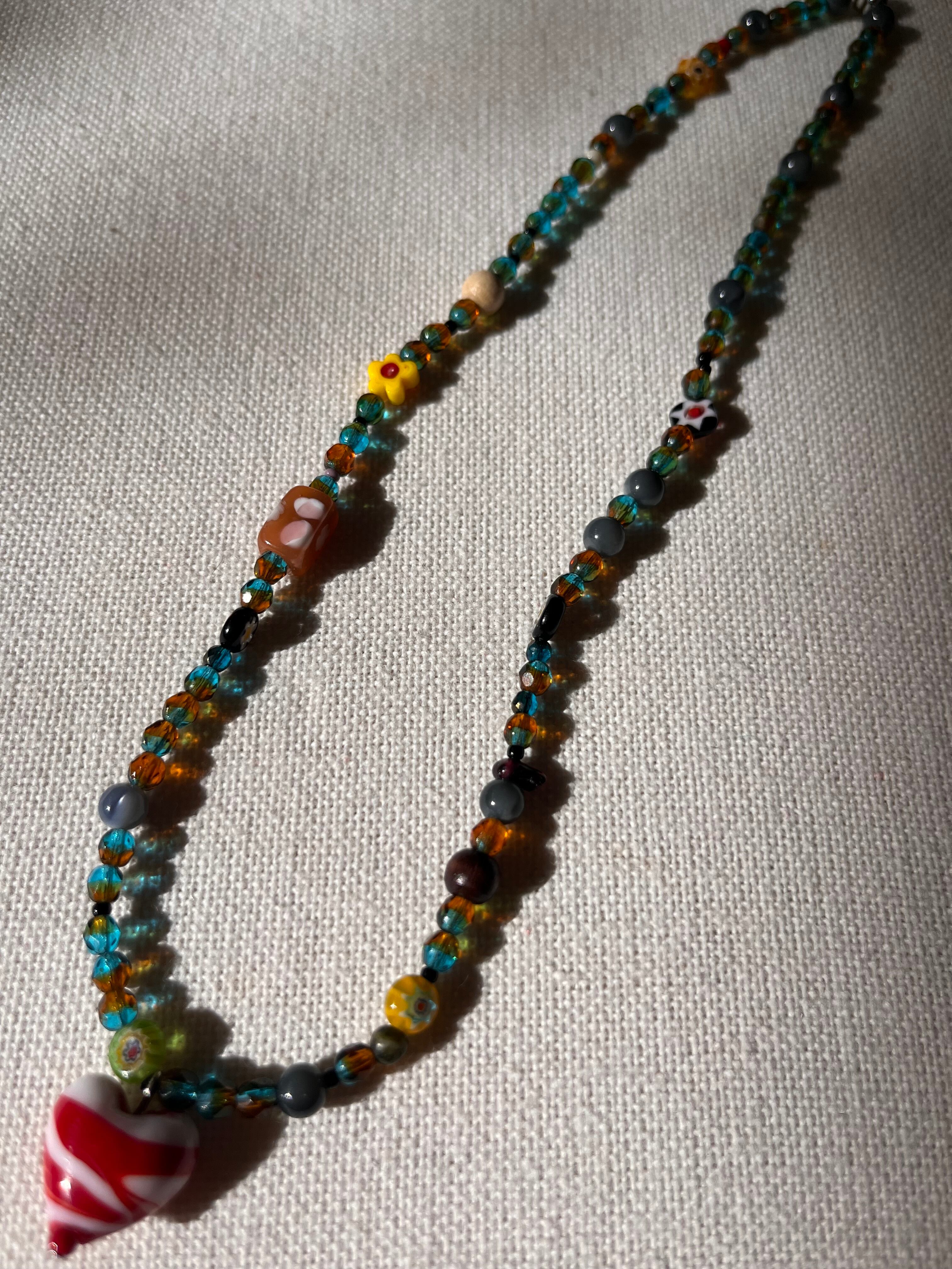 チェコビーズやミルフィオリビーズ、天然石、ガラスビーズをリズミカルに組み合わせ、胸元には赤と白のストライプ模様が印象的なガラスハートペンダントトップを添えました。
