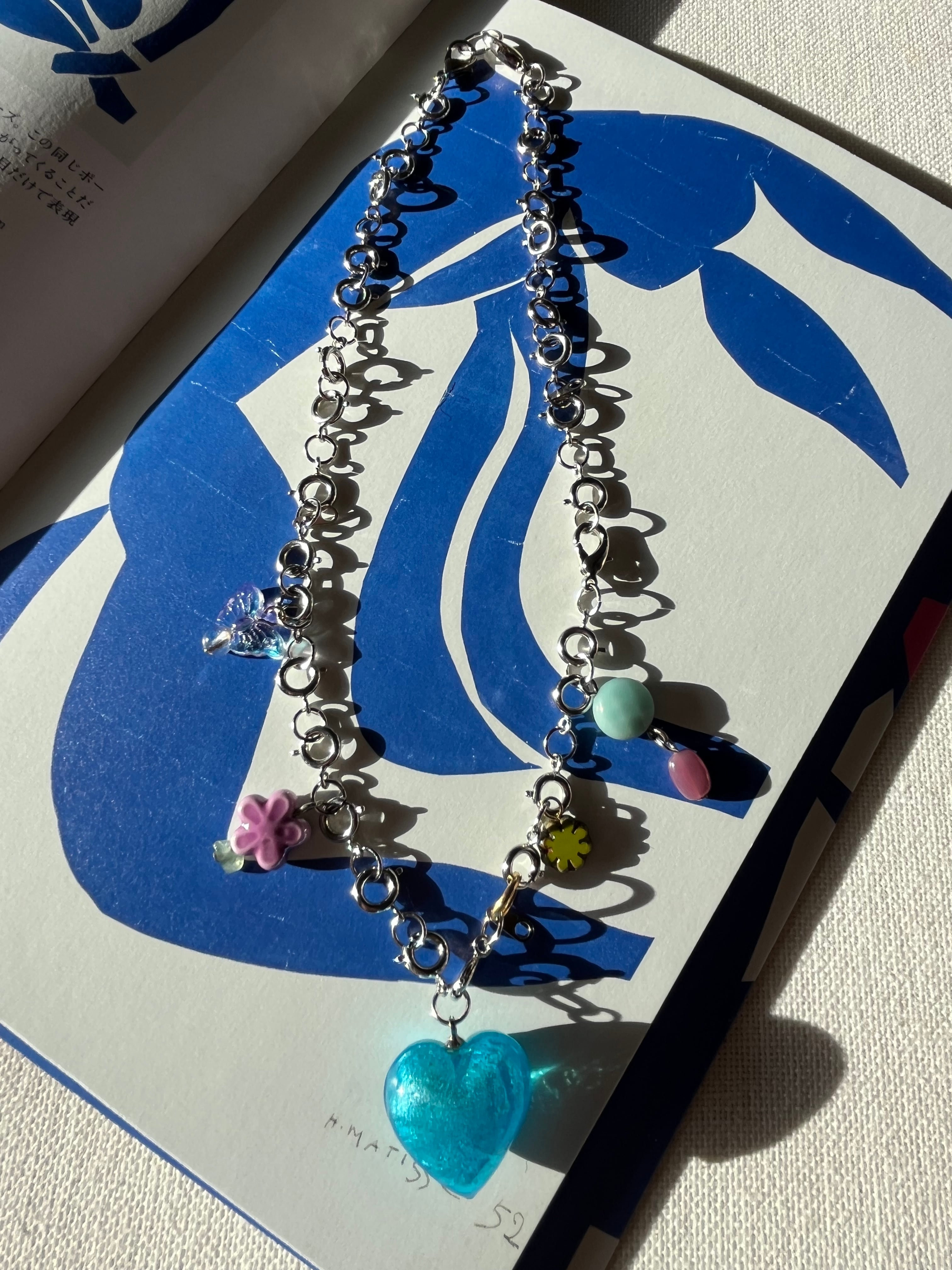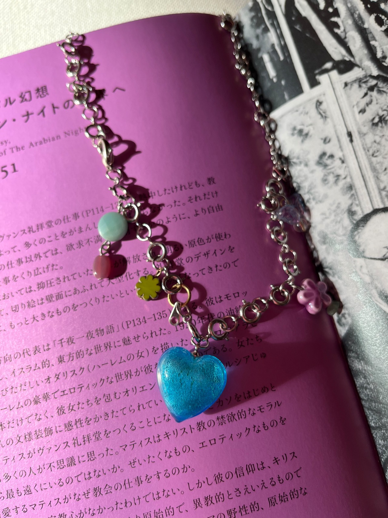 アップサイクルされたパーツに、ガラスハート・チェコビーズ・セラミックビーズを飾り付け、着けた人が軽やかに輝き自由に羽ばたく様子をイメージして仕立てた一点物のネックレスです。
