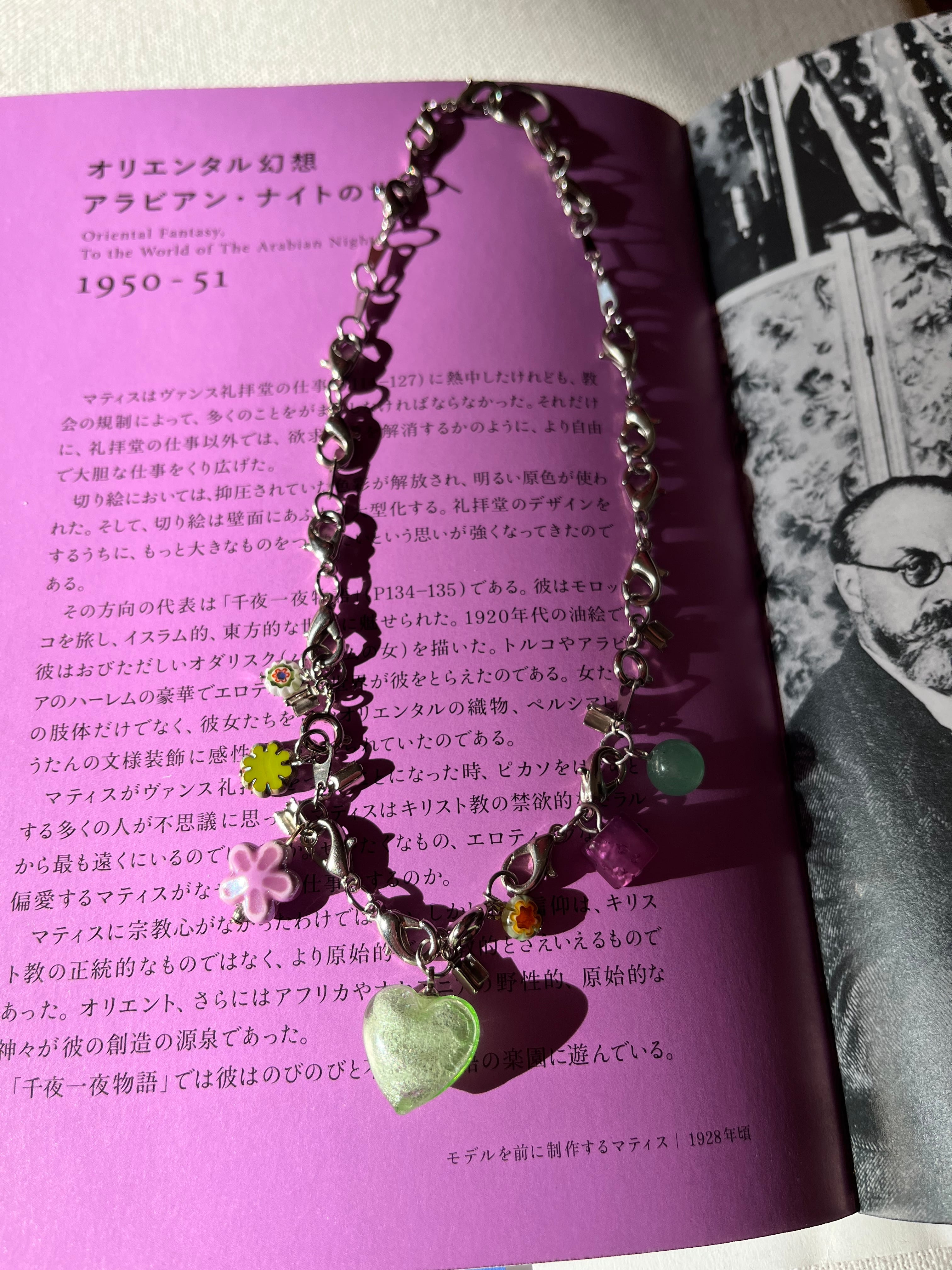 アップサイクルされたパーツに、ガラスハート・チェコビーズ・セラミックビーズを飾り付け、着けた人が軽やかに輝き自由に羽ばたく様子をイメージして仕立てた一点物のネックレスです。