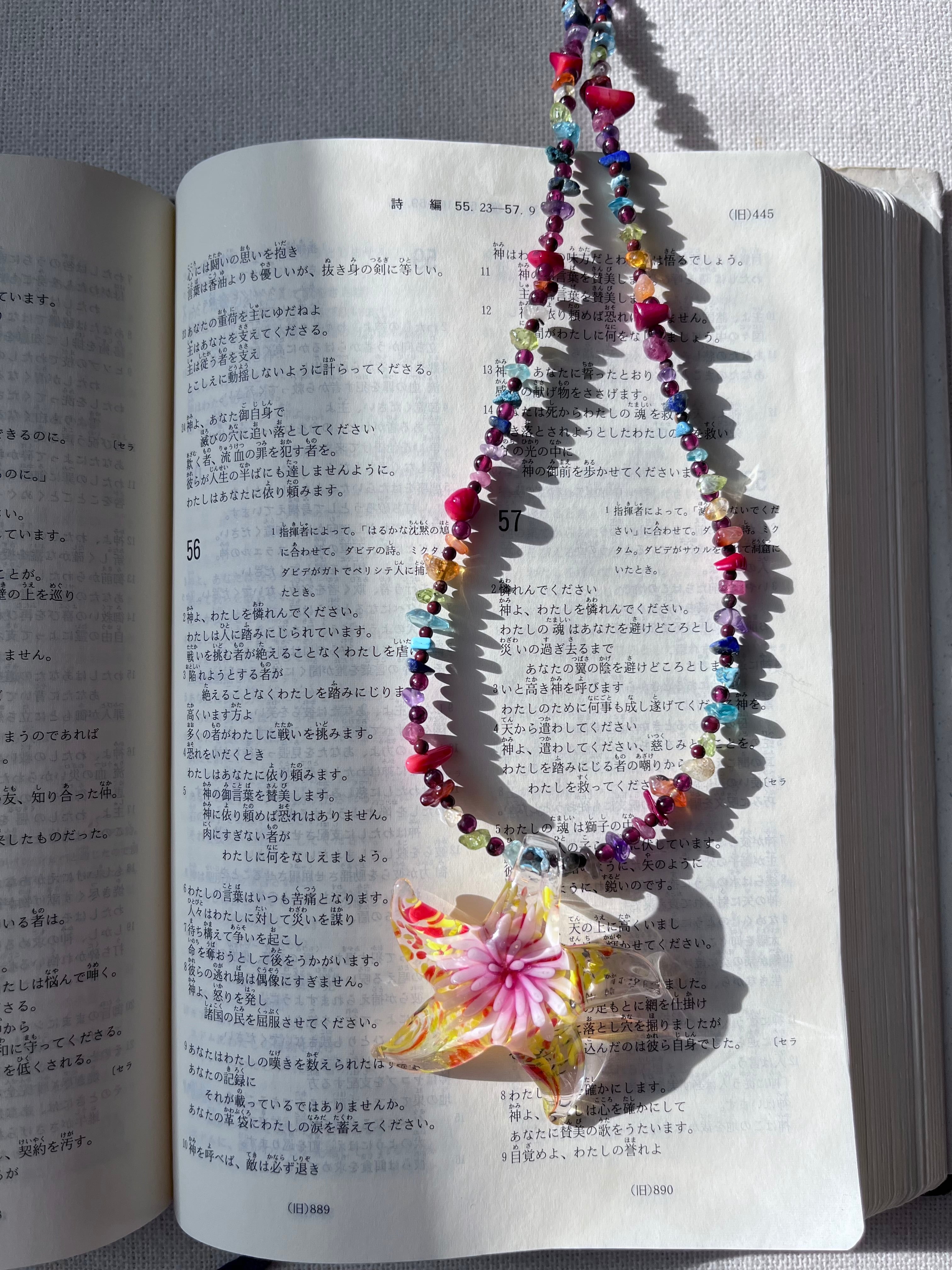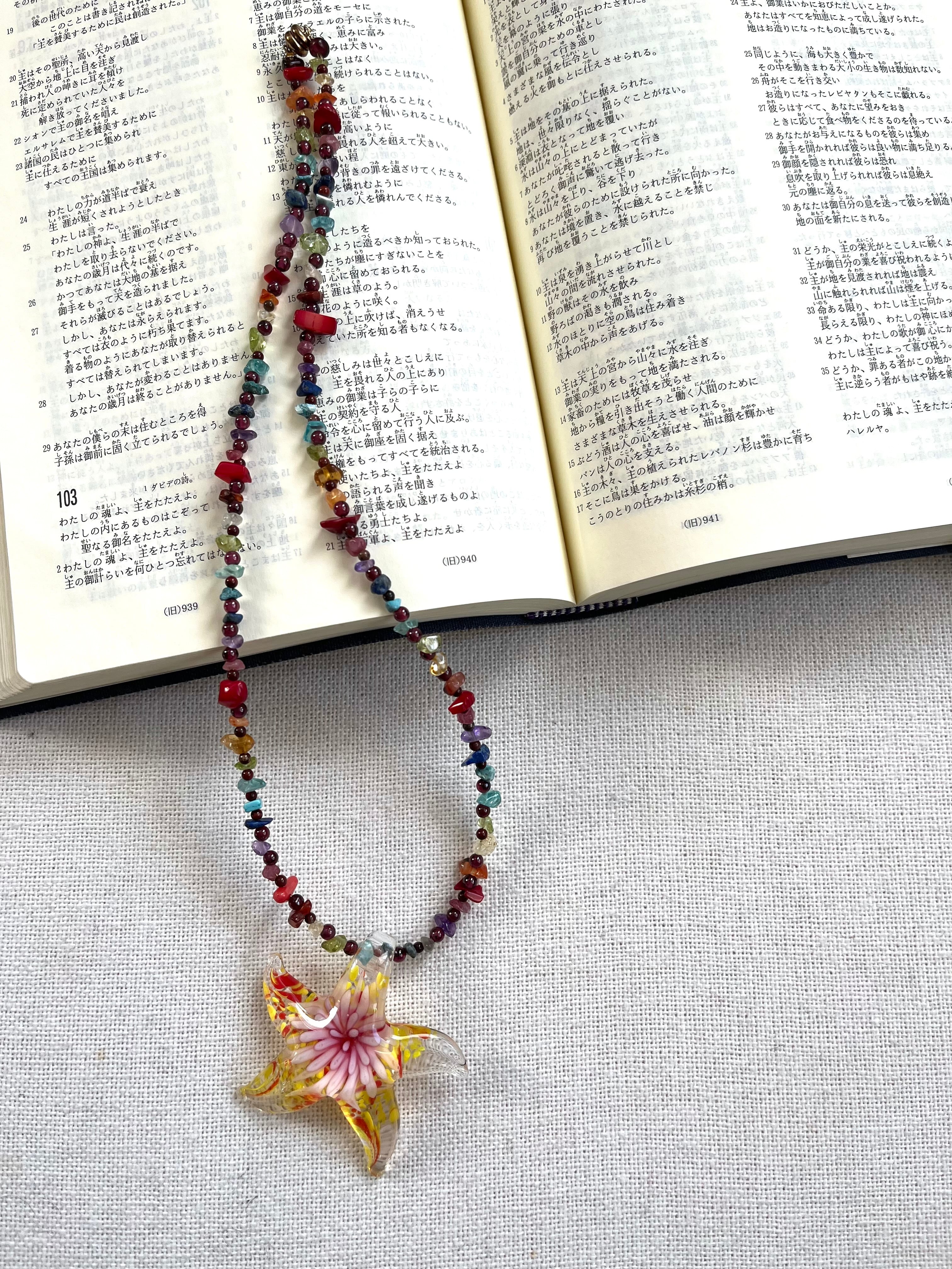 ・素材:ガーネット石ビーズ(アップサイクル)、天然石(ガーネット、サンゴ、カーネリアン、ペリドット、シトリン、ラピスラズリ、アメジスト、ピンクトルマリンなど)、ガラスペンダントトップ